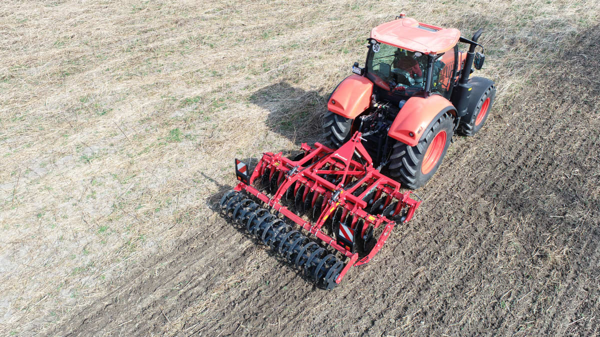 Диапазон операций универсален: мелкая и глубокая обработка стерни (от 2 до 10 см), а также подготовка семенного ложа после вспашки. Благодаря большим коническим дискам и большому междурядному расстоянию 900 мм, он также обеспечивает отличную производительность при заделке промежуточных седеративных культур.